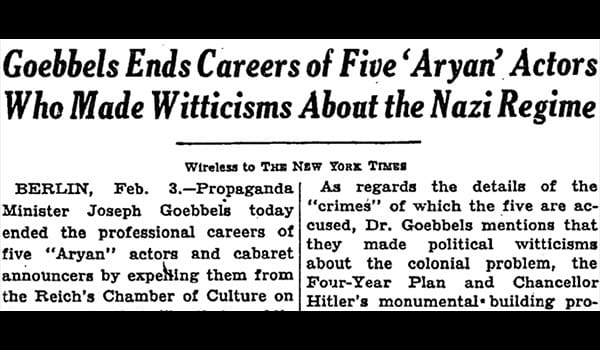 In February 1939, Nazi Propaganda Minister Joseph Goebbels “ended the professional careers” of five comedians by expelling them from the Chamber of Culture on accusations that “in their public appearances they displayed a lack of any positive attitude toward National Socialism and therewith caused grave annoyance in public and especially to party comrades.”