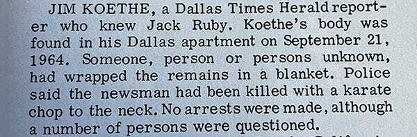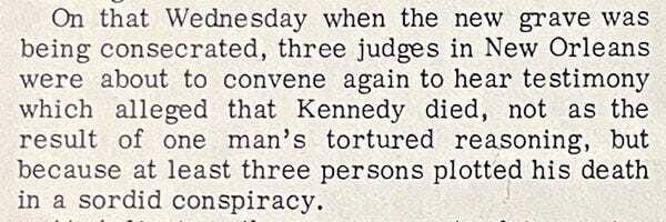 Except there’s this one weird, out of nowhere paragraph about how on the same day they were consecrating that memorial, a bunch of no-good-niks were in New Orleans asking a bunch of questions about what really happened to JFK.