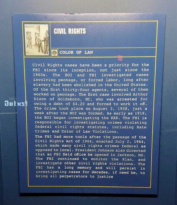 I tragically lost a bunch of pictures I took of the FBI exhibit, but I did manage to keep the one of this genuinely hilarious plaque that’s all about how the FBI has always been committed to upholding civil rights.